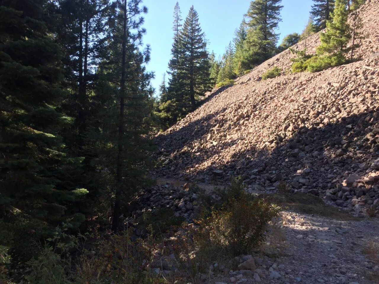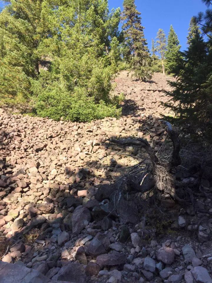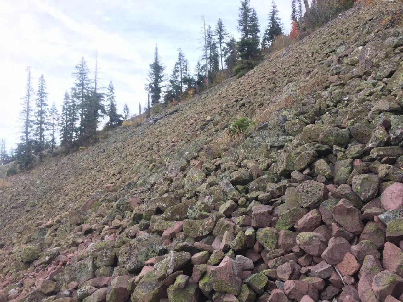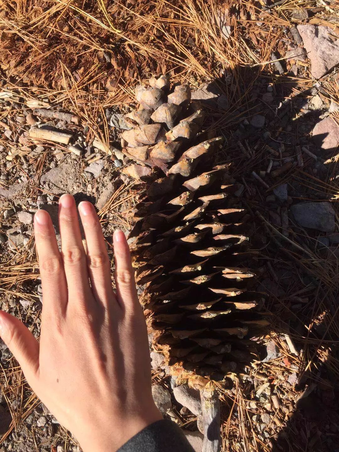 在雪士达山的公路上,黑曜石山看起来黑黑的,很是荒凉,也没什么植被。我们第一次按着地图走到最近的山脚下,黑曜石山看起来红彤彤的,石头都是粉色的,跟公路上看到黑乎乎的山还是差很远,有时候都会怀疑是不是走错路了,过去的小路上树木给人的感觉很清新,又有阳刚之气,一棵很普通的松树,上面的松果比我的脚还大好多,可以说尽显阳刚之气。